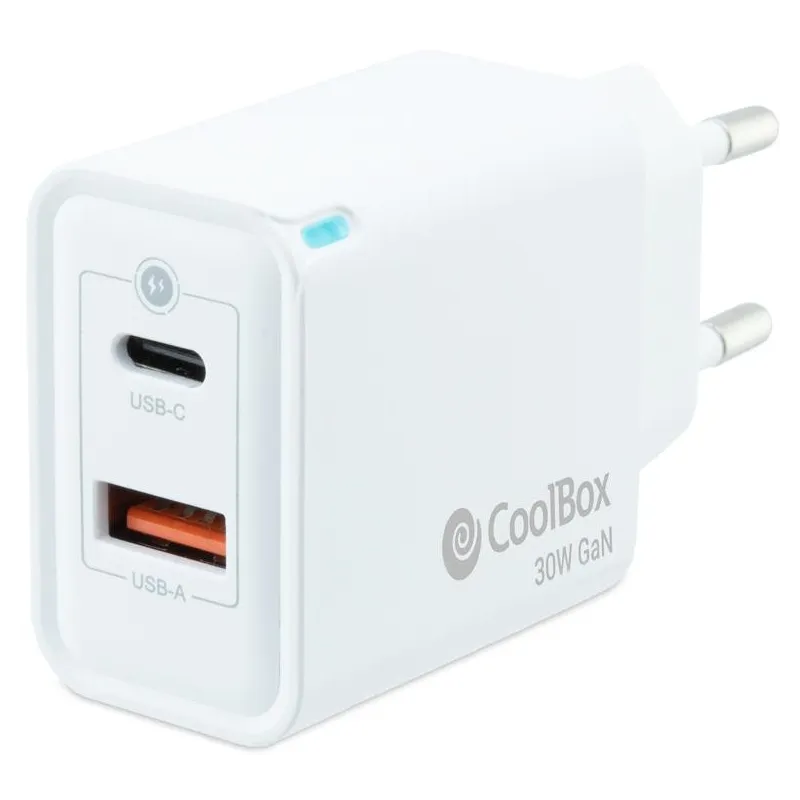 Cargador de Móvil Coolbox COO-CUP-30CA con 30W USB-C y USB 2.0 protección contra sobrecargas tecnología GaN