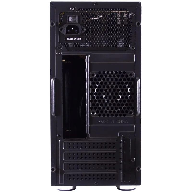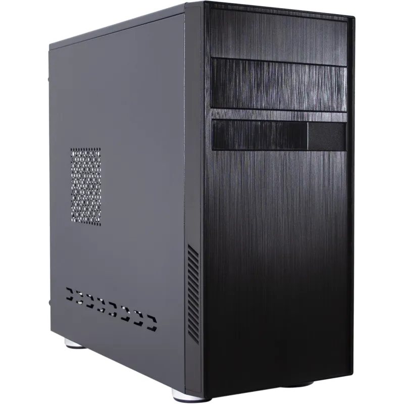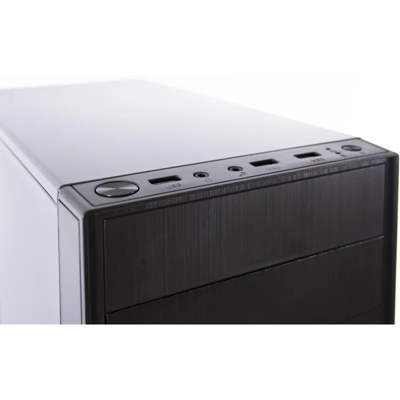 Este PC de formato Micro Torre se presenta en un elegante color negro y es compatible con tarjetas madre de tipo micro ATX. Su diseño incluye 2 puertos de 3.5", 1 puerto de 5.25", 3 bahías de 2.5" y 4 ranuras de expansión, ofreciendo una notable flexibilidad para diferentes configuraciones. Además, dispone de un práctico botón de restaurar y un botón de encendido/apagado.