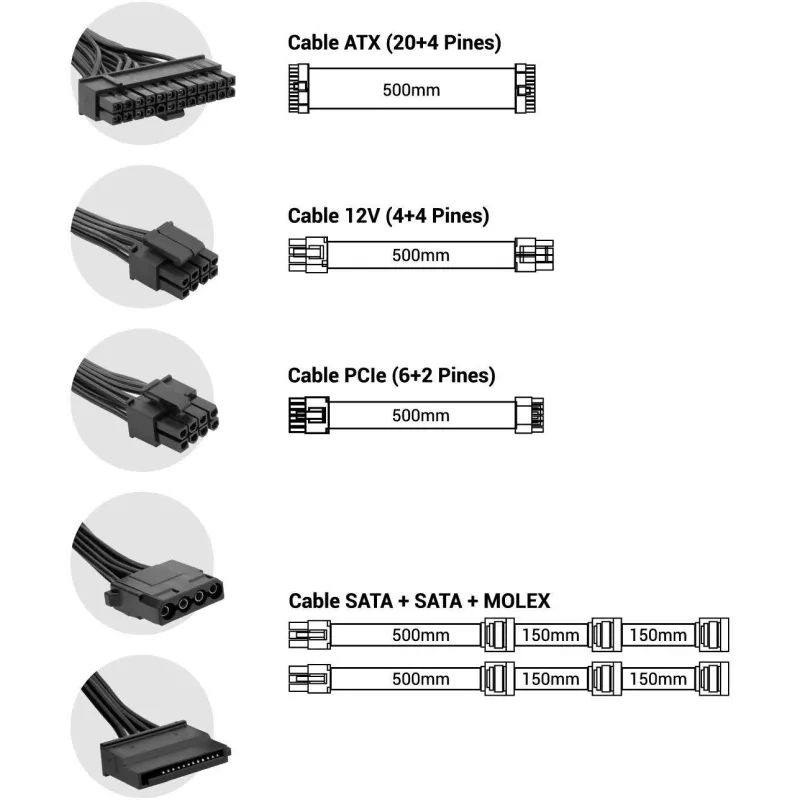 INTERFACES CONFIABLES Y VERSÁTILES: Diseñada para satisfacer las necesidades de diversas configuraciones, cuenta con un alimentador de energía para tarjeta madre de 20+4 pin ATX y una longitud de cable de 50 cm para facilitar su instalación. Sus cuatro conectores de energía SATA, con cables de alimentación de 500 y 650 mm, permiten una conexión óptima de dispositivos. Además, incluye dos conectores periféricos Molex de 4 pines, con cables de 700 mm, y un conector PCI Express de 6+2 pines, asegurando compatibilidad con una amplia gama de componentes. El conector de alimentación para CPU de 4+4 pines añade una capa extra de funcionalidad para sistemas avanzados.
