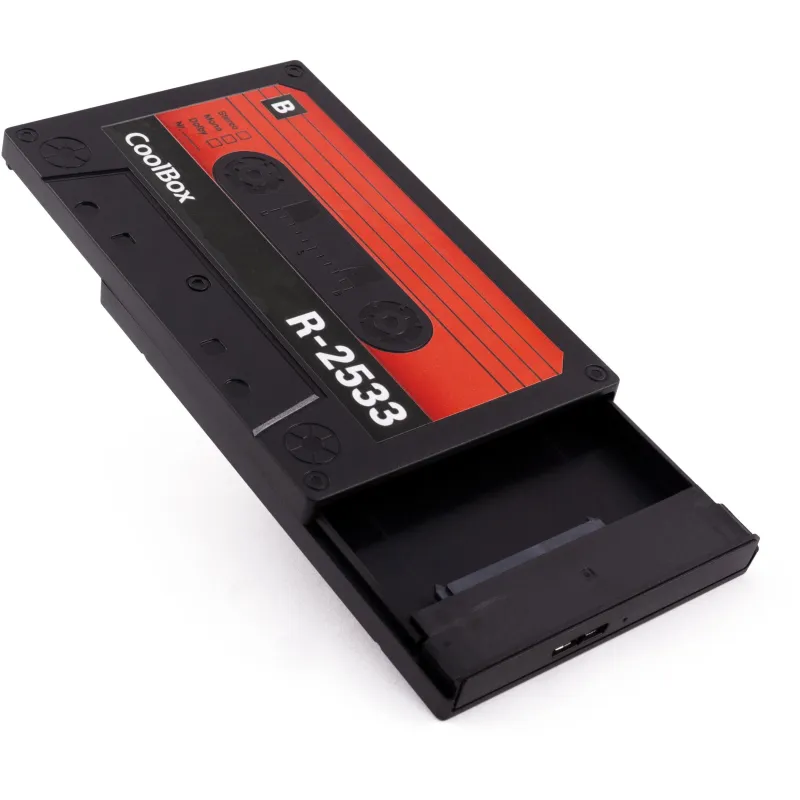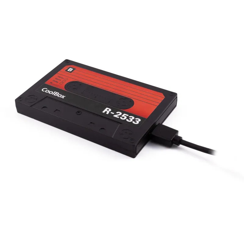 APROVECHA TU VIEJO DISCO DURO: Aprovecha tu viejo disco duro y dale un toque de estilo con la carcasa SlimChase R-2533 de CoolBox, gracias a su original diseño estilo cassette de audio. Compatible con unidades SSD y HDD 2.5” SATA de 7mm y 9.5mm, con conexión USB3.0 (cable incluido) y soporte UASP para optimizar la conexión USB y el acceso y transferencia de datos. Dimensiones 120x77x13mm, peso 49gr