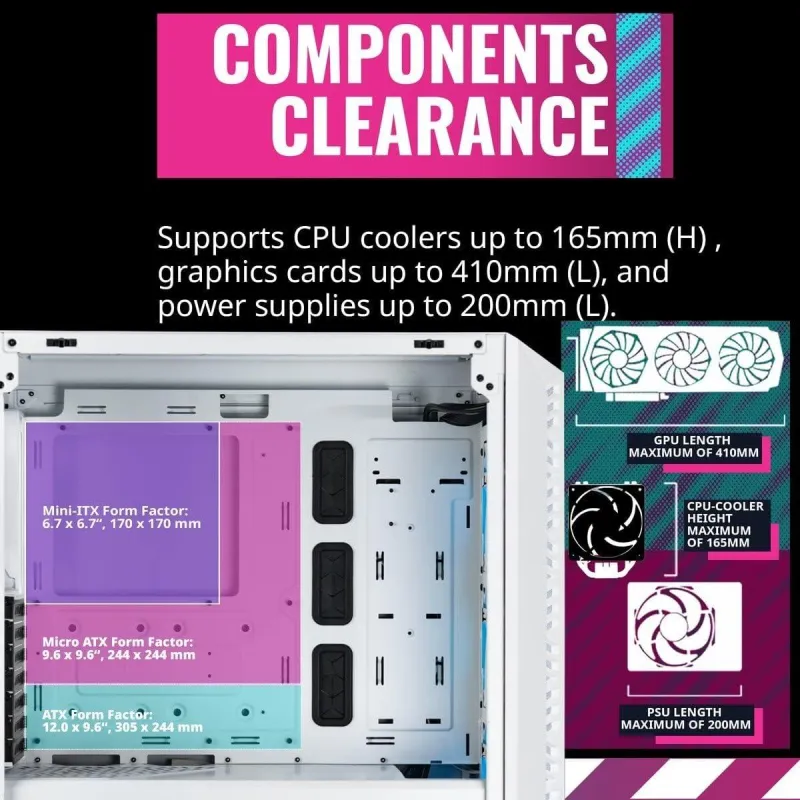 DISEÑO INNOVADOR: La estructura robusta, confeccionada con ABS, vidrio templado y acero, asegura una durabilidad sin igual. Su factor de forma Midi Tower permite una integración perfecta en cualquier entorno, combinando estética y funcionalidad en un elegante color blanco. Compatible con múltiples formas de factor de tarjeta madre, desde ATX hasta Mini-ITX, garantiza una versatilidad que se adapta a las necesidades de cualquier usuario. Sus siete ranuras de expansión y las bahías de 2.5" y 3.5" proporcionan un amplio espacio para personalizaciones y mejoras. La ventana lateral y la iluminación RGB multicolor ubicada en los ventiladores de la caja, no solo añaden un toque de distinción, sino que también permiten un vistazo al interior, destacando los componentes y la potencia de su sistema.