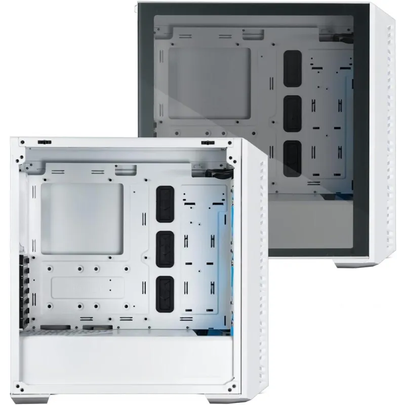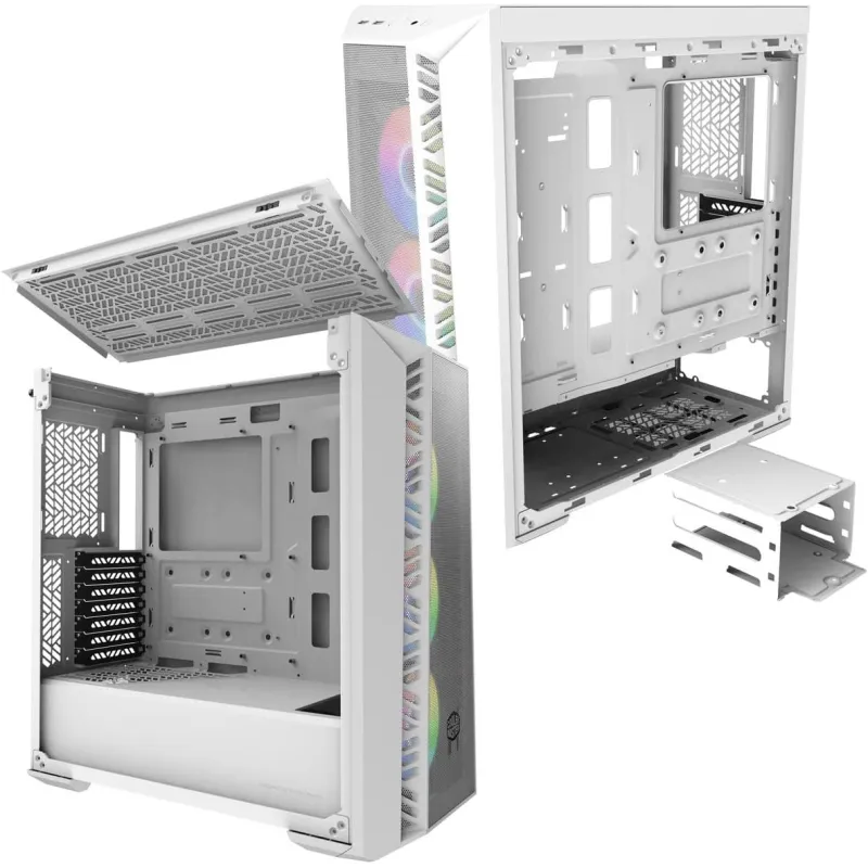 La caja de PC en formato Midi Tower combina un diseño elegante en color blanco con materiales de alta calidad como ABS, vidrio templado y acero. Es compatible con una amplia gama de tarjetas madre, incluyendo ATX, micro ATX, SSI CEB, Mini-ITX y EATX, ofreciendo versatilidad para diversas configuraciones. Dispone de 2 puertos de 3.5" y 3 bahías de 2.5", así como 7 ranuras de expansión. La ventana lateral y la iluminación RGB multicolor en los ventiladores le dan un toque moderno y personalizable.