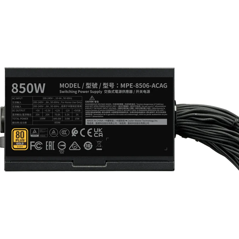 Fuente de Alimentación Cooler Master MWE GOLD 850 V3 con certificación 80 PLUS Gold, corriente máxima de salida 70.8 A