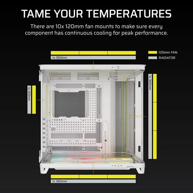 Diseñada para mantener temperaturas óptimas incluso en sistemas exigentes, la Torre Corsair AIR 5400 RGB LX-R iCUE Link blanca soporta una configuración de refrigeración superior. Incorpora tres ventiladores inferiores de 120 mm preinstalados y admite hasta nueve ventiladores 120 mm en total, distribuidos en posiciones frontales, superiores, traseras e inferiores. Además, es compatible con radiadores de hasta 360 mm en varias ubicaciones, lo que permite implementar sistemas de refrigeración líquida de alto rendimiento. La compatibilidad con PWM garantiza un control preciso de la velocidad de los ventiladores, asegurando un equilibrio perfecto entre rendimiento térmico y nivel sonoro. Esta capacidad convierte a la torre en una solución ideal para configuraciones potentes que requieren una disipación eficiente del calor.