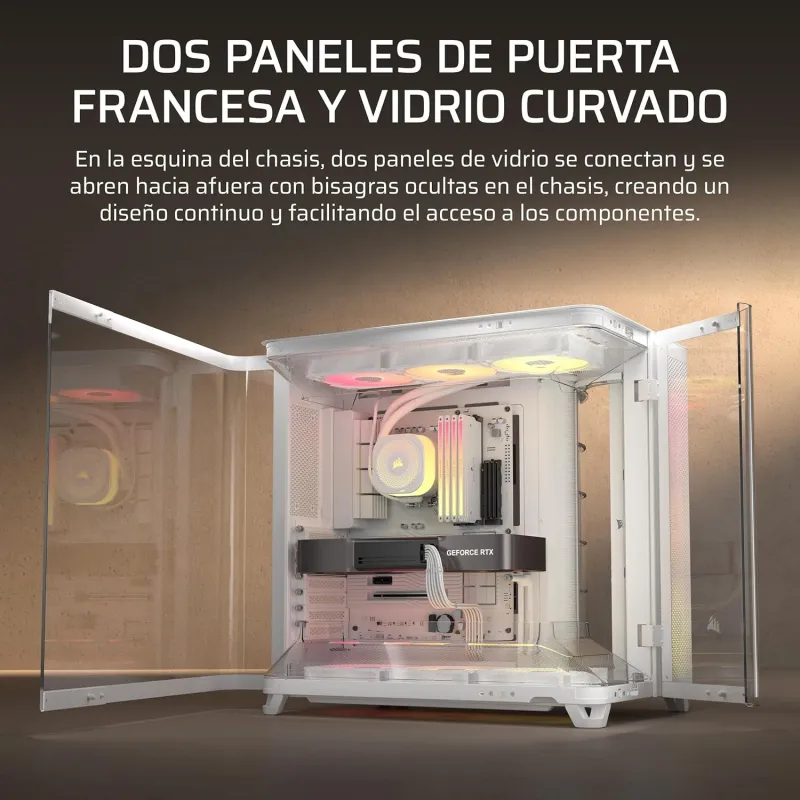 Con un panel de vidrio templado lateral, la Torre Corsair AIR 5400 RS-R ARGB Blanca permite lucir el interior del equipo con gran estilo. Este material no solo aporta resistencia y durabilidad, sino que también mejora la estética general del sistema. El diseño blanca y minimalista se combina con la iluminación multicolor de los ventiladores, generando un efecto visual moderno y atractivo. Además, su estructura de acero proporciona una base sólida para montar componentes de alto nivel. La torre admite tarjetas gráficas de hasta 36 cm y disipadores de CPU de hasta 18 cm, lo que permite configuraciones avanzadas sin restricciones. Todo esto se complementa con una excelente gestión de cables y filtros antipolvo, que facilitan el mantenimiento del sistema limpio y ordenado. La Torre Corsair AIR 5400 RS-R ARGB Blanca es la elección perfecta para quienes buscan funcionalidad sin renunciar al diseño.