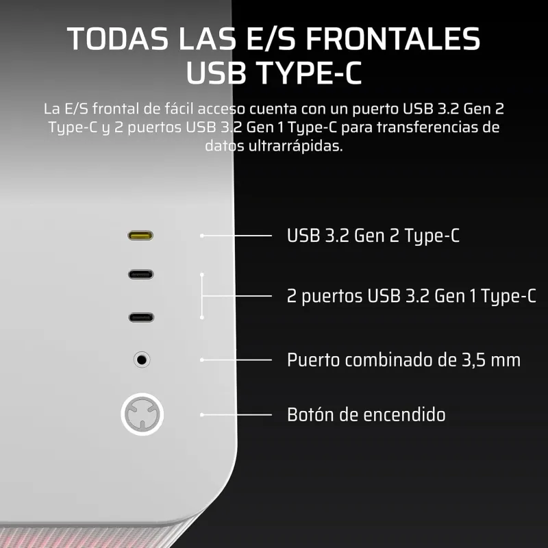 La Torre Corsair AIR 5400 RS-R ARGB Blanca ha sido diseñada para ofrecer la máxima compatibilidad con diferentes formatos de placa base, incluyendo ATX, EATX, micro ATX y Mini-ITX. Esta versatilidad permite adaptarse a múltiples configuraciones, desde sistemas compactos hasta estaciones de alto rendimiento. Además, cuenta con dos puertos USB Tipo C, incluyendo uno USB 3.2 Gen 2x2, lo que garantiza una conectividad rápida y eficiente con los dispositivos más modernos. También dispone de una salida combinada de auriculares y micrófono, ideal para gamers y creadores de contenido. Su diseño interno permite instalar hasta tres unidades de almacenamiento, combinando bahías de 2.5'' y 3.5''. Cada detalle ha sido pensado para ofrecer una experiencia de usuario cómoda, funcional y preparada para el futuro. En definitiva, la Torre Corsair AIR 5400 RS-R ARGB Blanca destaca por su equilibrio entre diseño, rendimiento y conectividad.
