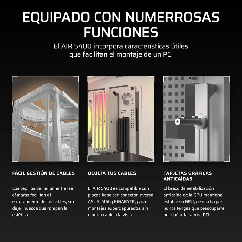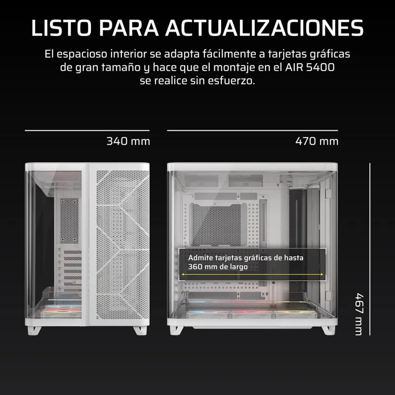 Gracias a sus dimensiones de 340 mm de ancho, 470 mm de profundidad y 467 mm de alto, la Torre Corsair AIR 5400 RS-R ARGB Blanca ofrece un espacio interno generoso para montar componentes de gran tamaño. Admite tarjetas gráficas de hasta 36 cm y fuentes de alimentación de hasta 20 cm, lo que permite integrar hardware de alto rendimiento sin limitaciones. El diseño interno facilita la instalación de sistemas de refrigeración líquida con radiadores de hasta 360 mm en la parte superior, frontal e inferior. Además, incluye un sistema de gestión de cables que mantiene el interior limpio y ordenado, mejorando tanto la estética como el flujo de aire. La estructura de acero y el panel de vidrio templado aportan solidez y elegancia, mientras que los ventiladores ARGB 120 mm aseguran una ventilación constante y silenciosa. Todo esto convierte a esta torre en una opción ideal para usuarios exigentes que buscan rendimiento y estilo.