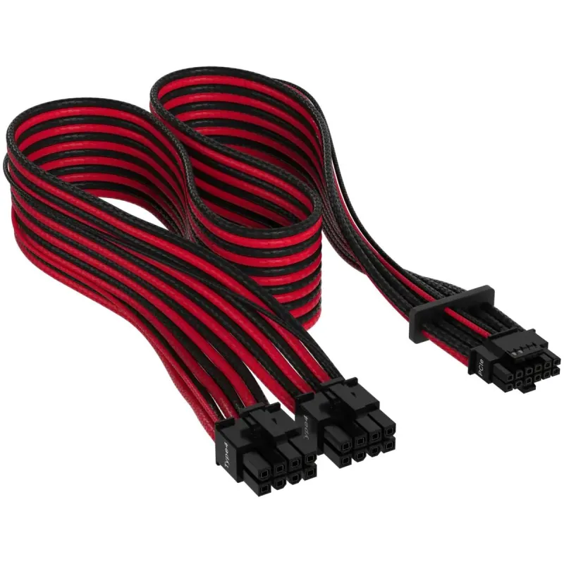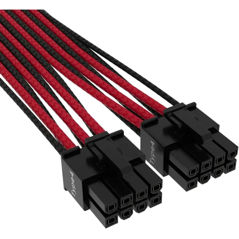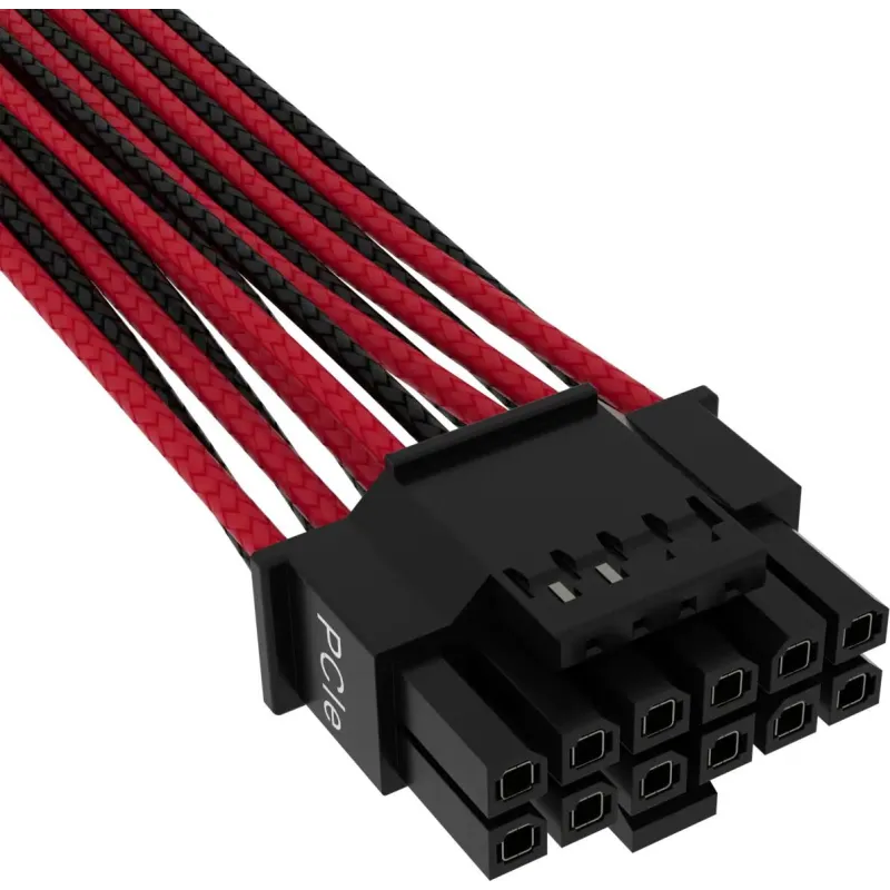 CABLE PRÉMIUM CON FUNDAS INDIVIDUALES PCIE GEN 5 12VHPWR DE 600 W Y 12+4 PATILLAS CON FUNDA INDIVIDUAL, TYPE 4, ROJO/NEGRO: El cable para PSU con fundas individuales oficial CORSAIR Premium PCIe 5.0/Gen 5 12VHPWR de 600 W suministra alimentación desde las PSU CORSAIR Type 4 a las tarjetas gráficas PCIe 5.0 más avanzadas.