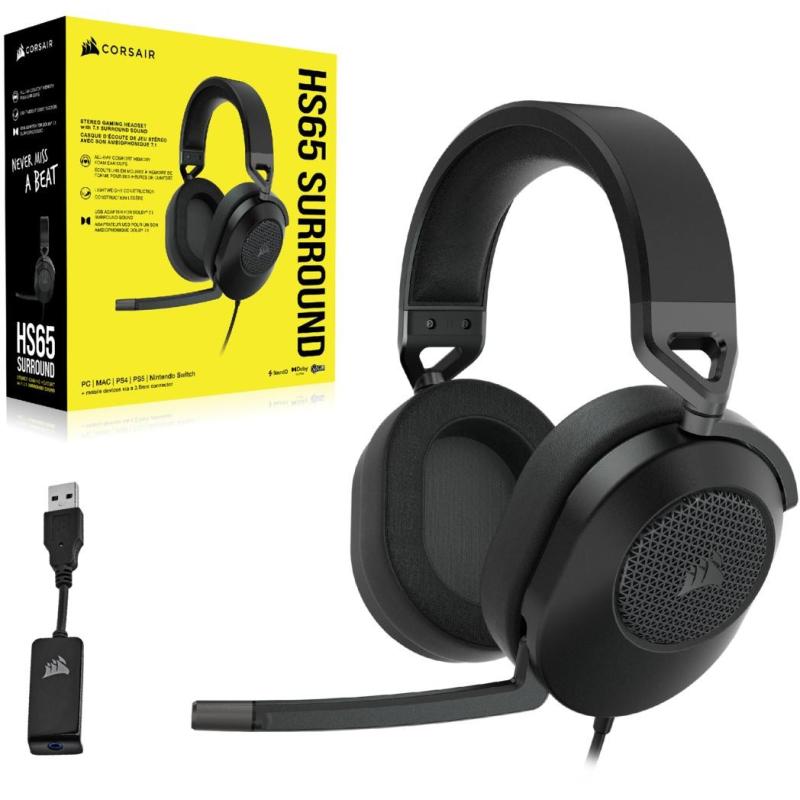 AURICULARES PARA JUEGOS CON CABLE HS65 SURROUND, CARBÓN (EU): Los auriculares para juegos CORSAIR HS65 SURROUND ofrecen comodidad y sonido durante todo el día con almohadillas de memoria viscoelástica y polipiel, un diseño ligero reforzado con aluminio y el sonido envolvente Dolby Audio 7.1 en PC y Mac.
