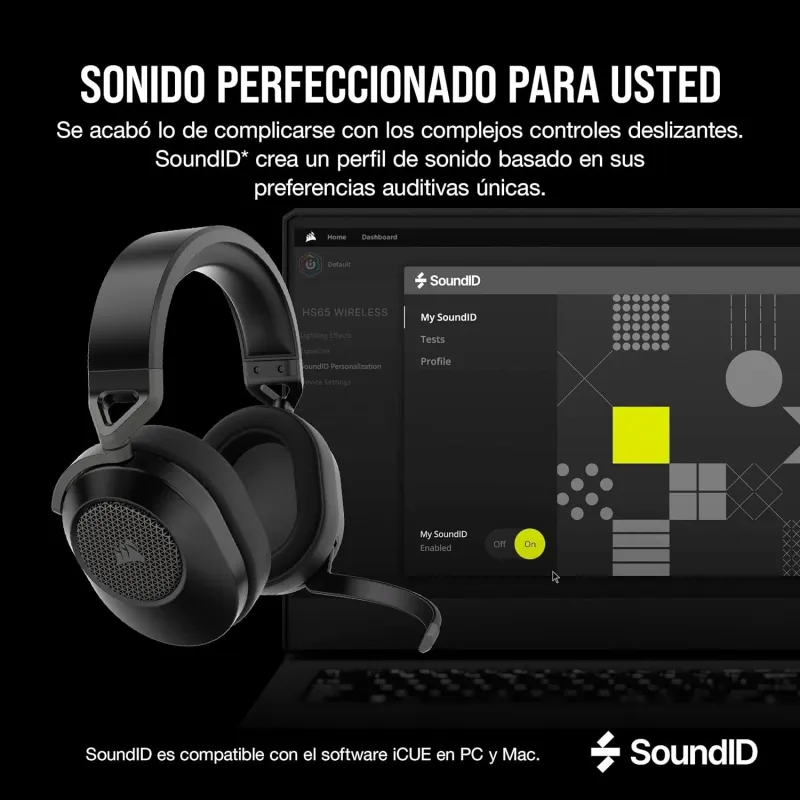 SONIDO PERFECCIONADO PARA TI: Obtenga la mejor experiencia auditiva en juegos y música en HS65 WIRELESS con SoundID de Sonarworks. Integrado en CORSAIR iCUE, SoundID personaliza el perfil de audio de los auriculares para adaptarlo a sus preferencias auditivas únicas. No más complicaciones con controles deslizantes complejos: simplemente realice una prueba rápida de preferencias para crear su perfil de sonido perfecto.