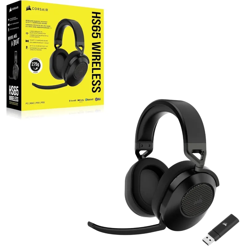 AURICULARES PARA JUEGOS HS65 WIRELESS, CARBÓN (EU): Los auriculares para juegos CORSAIR HS65 WIRELESS combinan audio inalámbrico de baja latencia a 2,4 GHz, Bluetooth y sonido envolvente Dolby Audio 7.1 inalámbrico de 2,4 GHz en PC con un diseño ligero reforzado con aluminio.