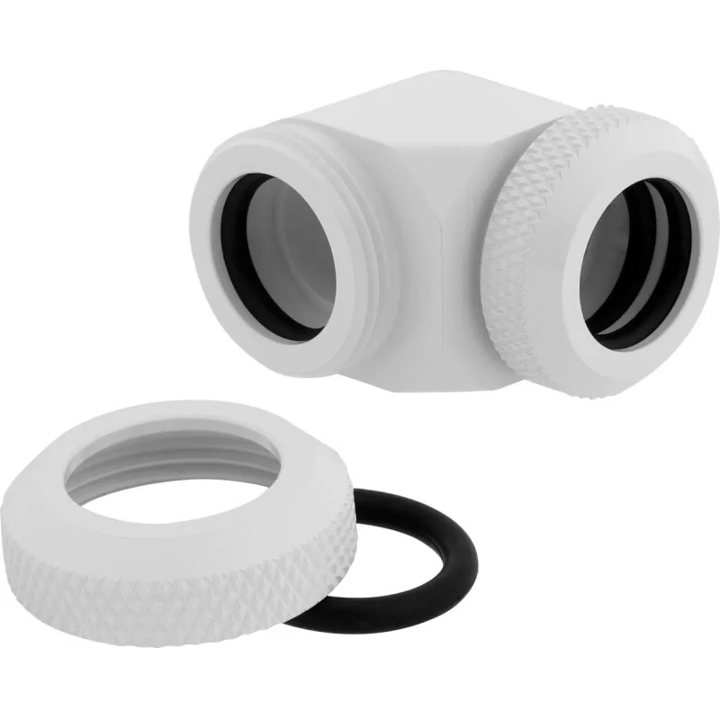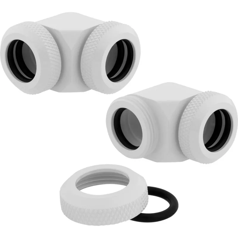 CONECTOR 12 MM DE 90° DE HYDRO X SERIES XF RÍGIDO (PACK DE DOS UNIDADES) — BLANCO: Los conectores CORSAIR Hydro X Series XF rígidos brindan un ajuste perfecto para su sistema de refrigeración personalizado de tubos rígidos, disponibles en una gran variedad de estilos y equipados con un sello de compresión de junta tórica doble.