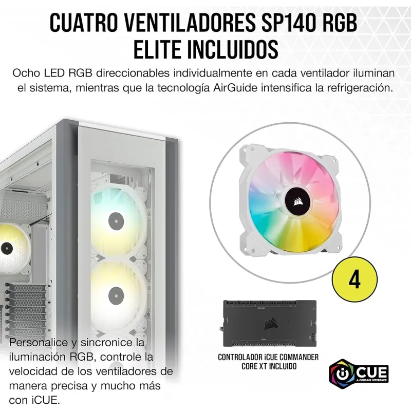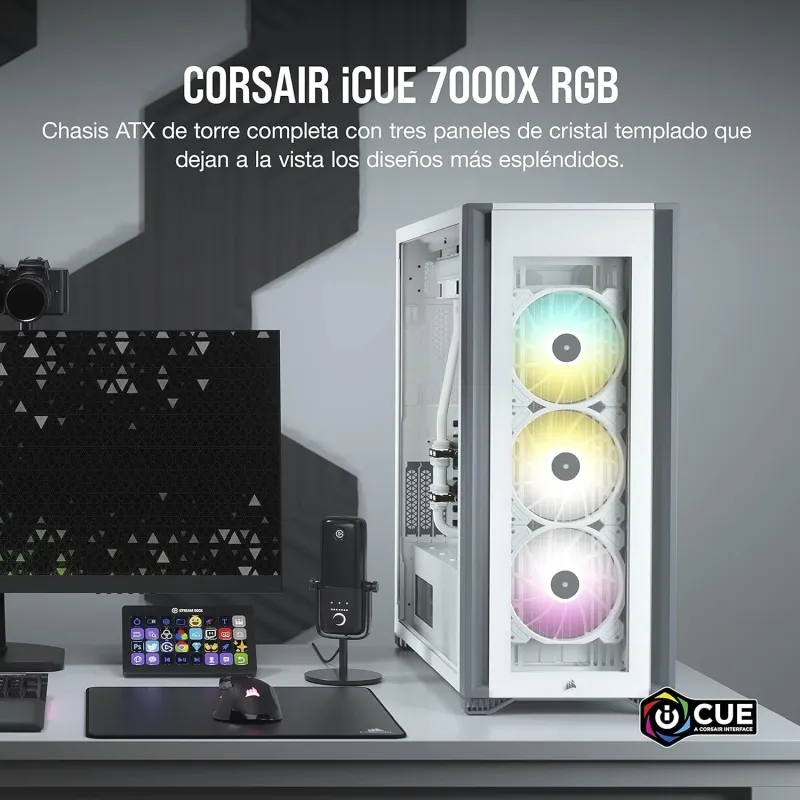 CHASIS PARA PC ATX TIPO TORRE CON CRISTAL TEMPLADO ICUE 7000X RGB: El chasis ATX tipo torre CORSAIR iCUE 7000X RGB muestra su sistema gracias a tres paneles de cristal templado, con espacio para tres radiadores de 360 mm, cableado oculto y cuatro ventiladores CORSAIR SP140 RGB ELITE incluidos.