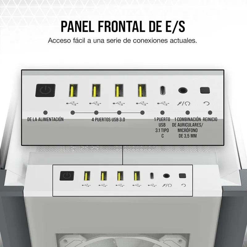 MODERNO PANEL FRONTAL DE E/S: Permite acceder a las conexiones con facilidad: dispone de un puerto USB 3.1 Type-C, cuatro puertos USB 3.0 y un conector de micrófono y audio.