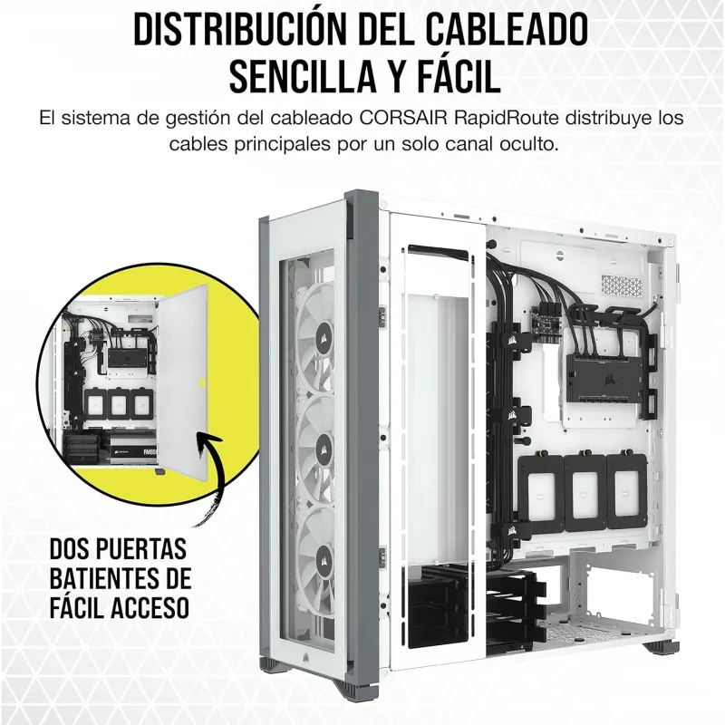 GESTIÓN DEL CABLEADO CORSAIR RAPIDROUTE: Pase los cables principales de forma más rápida y sencilla por un solo canal oculto, con unos amplios 25 mm de espacio detrás de la placa base para todos los cables, que se oculta con facilidad mediante una puerta de acero con bisagras.