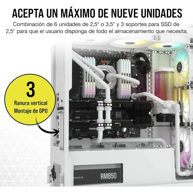 El sistema de enfriamiento es completo, con tres ventiladores frontales de 120 mm ya instalados y espacio para hasta tres, así como la posibilidad de instalar radiadores de enfriamiento líquido en la parte frontal y superior. El gabinete soporta discos duros de 3.5" y SSDs de 2.5", ofreciendo flexibilidad en opciones de almacenamiento.