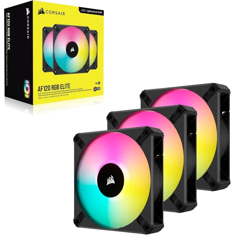 JUEGO DE TRES VENTILADORES PWM DE 120 MM iCUE AF120 RGB ELITE: Los ventiladores PWM CORSAIR AF120 RGB ELITE de alto rendimiento y 120 mm ofrecen velocidades controladas por PWM desde 550 RPM hasta 2.100 RPM para una refrigeración potente, un funcionamiento silencioso y una intensa iluminación RGB.