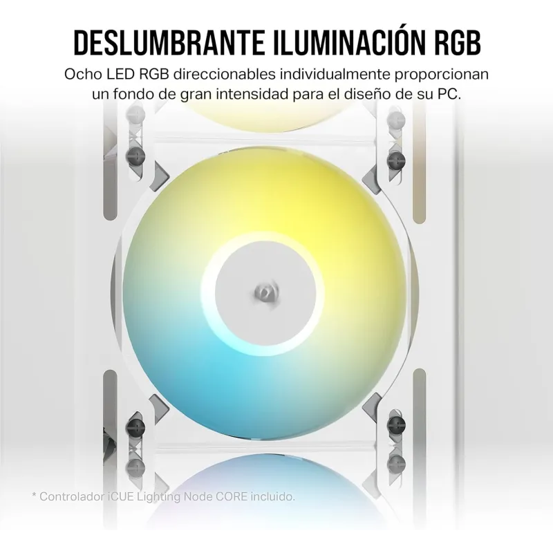 Diseñados en color blanco, cada ventilador incluye iluminación LED multicolor que añade un atractivo visual a cualquier configuración de PC. Este paquete incluye tres ventiladores, cada uno con dimensiones de 120 mm de ancho, 120 mm de profundidad y 25 mm de altura, y un peso total de 534 g. Su máxima corriente de operación es de 0,38 A, asegurando un rendimiento eficiente y seguro.