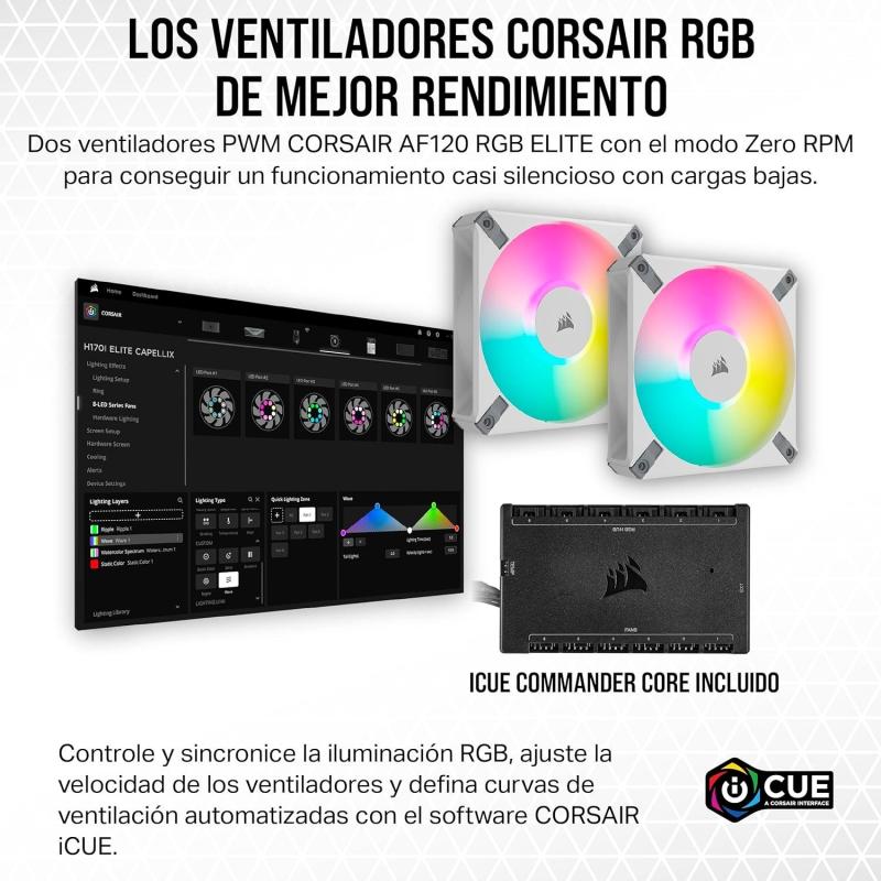 REFRIGERACIÓN LÍQUIDA DE CPU ICUE H100I ELITE CAPELLIX XT: El refrigerador líquido de CPU CORSAIR iCUE H100i ELITE CAPELLIX XT ofrece una refrigeración potente y de alto rendimiento para su procesador, con ventiladores CORSAIR AF RGB ELITE, un radiador de 240 mm y LED CAPELLIX ultrabrillantes.