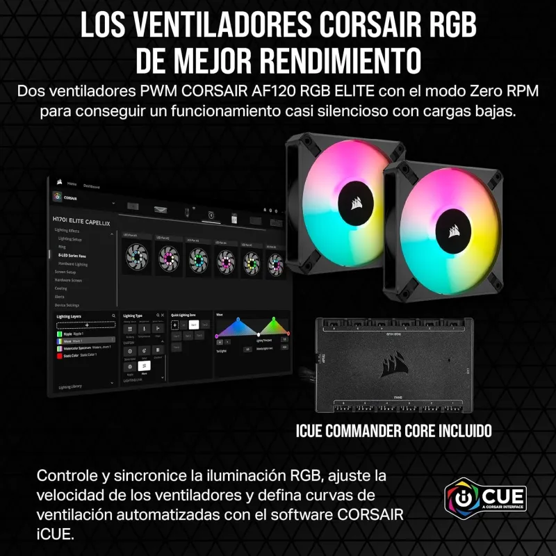 NUESTROS VENTILADORES RGB DE MEJOR RENDIMIENTO: Los ventiladores CORSAIR AF RGB ELITE PWM ofrecen un flujo de aire enorme y silencioso, y cuentan con la tecnología AirGuide para disfrutar de un rendimiento de refrigeración de la CPU extremo.