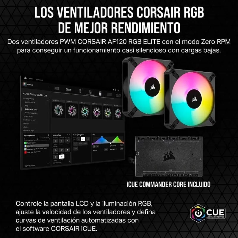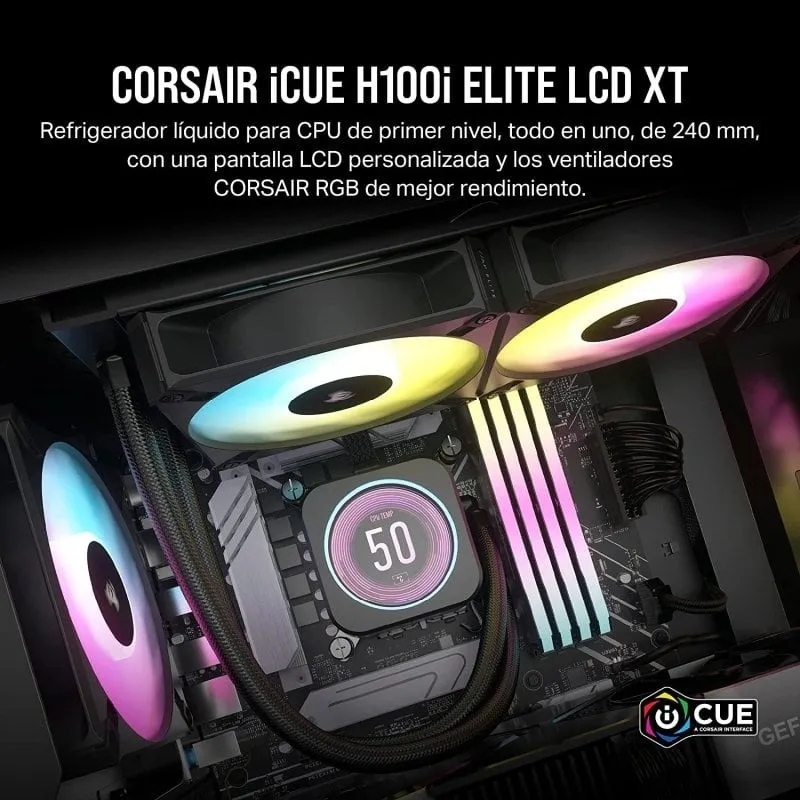 REFRIGERADOR LÍQUIDO PARA CPU CON PANTALLA CORSAIR ICUE H100I ELITE LCD XT: El refrigerador líquido para CPU CORSAIR iCUE H100i ELITE LCD XT ofrece una refrigeración potente y personalizada para su CPU; además, consta de una pantalla LCD personalizada que le permite visualizar GIF, imágenes e información del sistema.