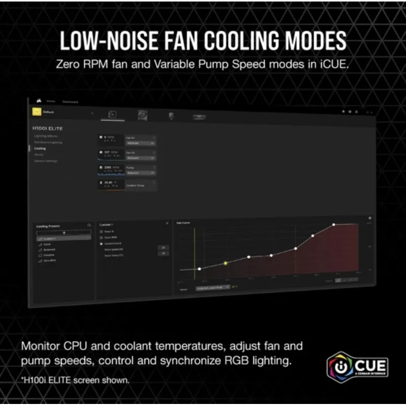 MODOS DE REFRIGERACIÓN ESPECIALIZADOS: Los modos de refrigeración especializados de velocidad variable de la bomba y Zero RPM en iCUE mantienen el ruido al mínimo cuando el sistema está en reposo o bajo cargas ligeras.
