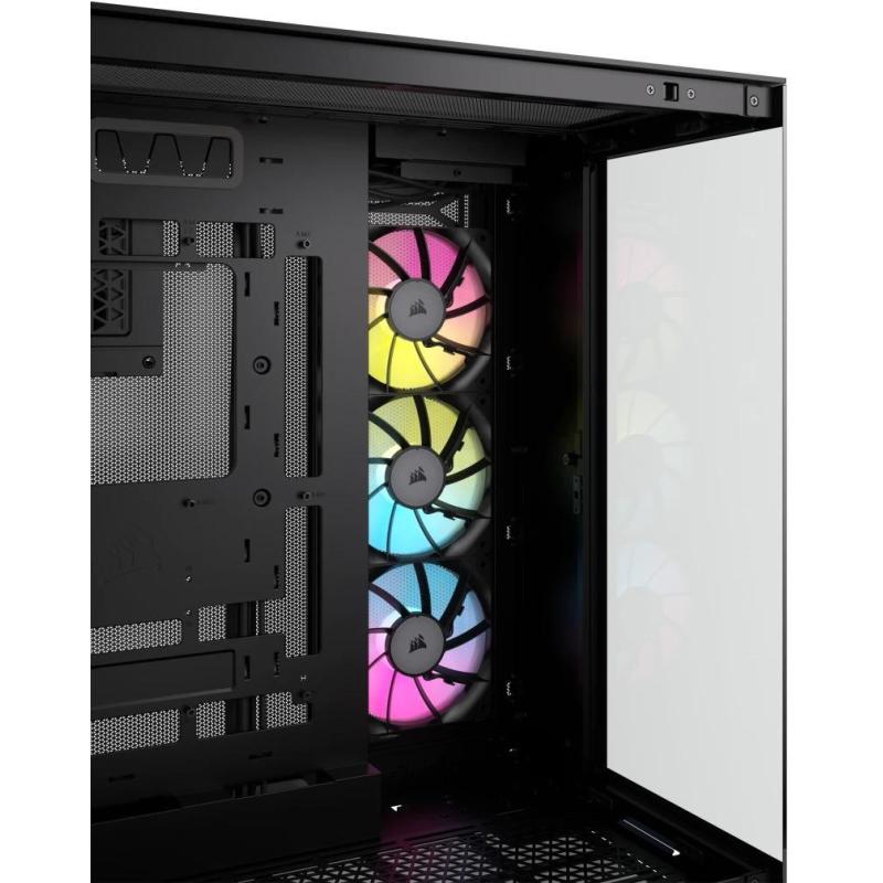 La CORSAIR iCUE LINK 6500X RGB Mid-Tower Dual Chamber PC Case ofrece una vista organizada de tu PC SFF a través de paneles de vidrio templado duales, con tres ventiladores RX120 RGB preinstalados.