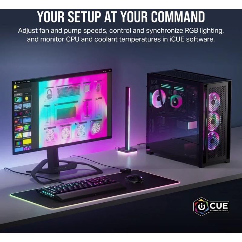 CONFIGURACIÓN BAJO SU CONTROL: Ajuste las velocidades de los ventiladores y la bomba, controle y sincronice la iluminación RGB y supervise las temperaturas de la CPU y del refrigerante en iCUE.