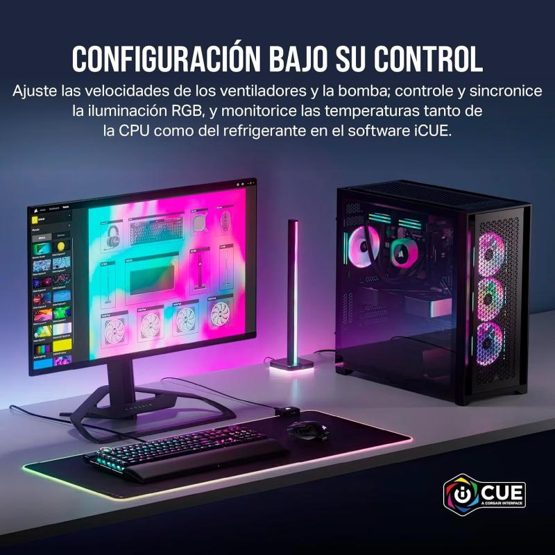 CONFIGURACIÓN BAJO SU CONTROL: Ajuste las velocidades de los ventiladores y la bomba, controle y sincronice la iluminación RGB y supervise las temperaturas de la CPU y del refrigerante en iCUE.