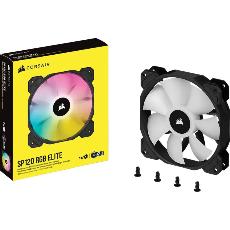 VENTILADOR PWM DE 120 MM ICUE SP120 RGB ELITE PERFORMANCE — PAQUETE SIMPLE: El CORSAIR iCUE SP120 RGB ELITE Performance Fan incluye ocho LED RGB intensos y direccionables individualmente, que se añaden a la brillante iluminación RGB del sistema de refrigeración SP RGB ELITE.