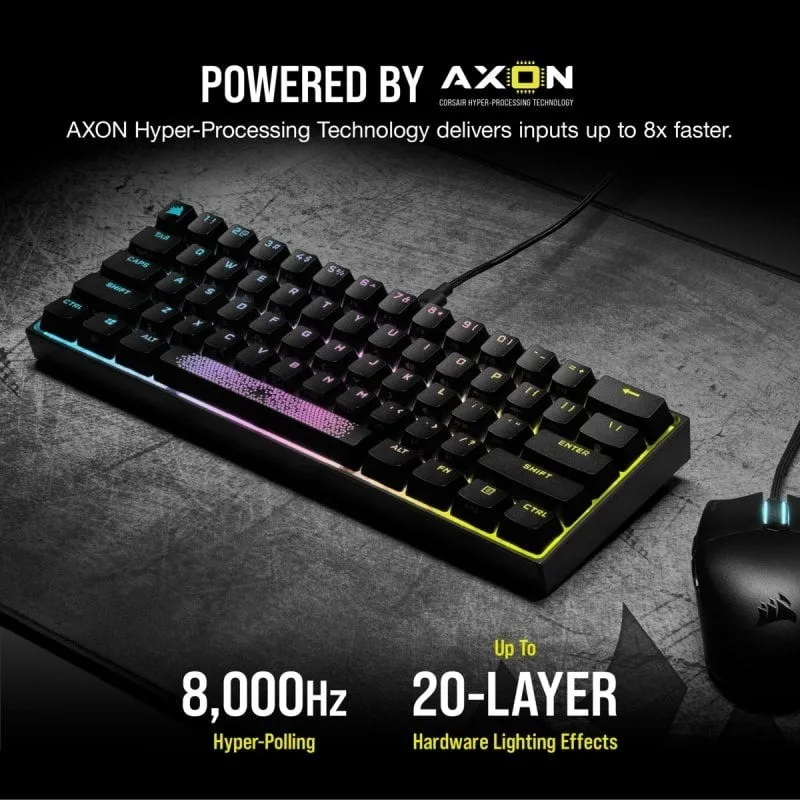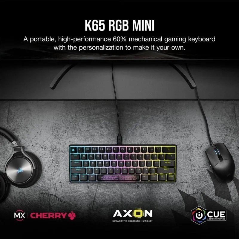 TECLADO MECÁNICO PARA JUEGOS K65 RGB MINI 60% — CHERRY MX SPEED — BLACK (ES): El teclado mecánico para juegos CORSAIR K65 RGB MINI 60% combina rendimiento de alto nivel con portabilidad, incluye la tecnología de hiperprocesamiento AXON, interruptores de teclas mecánicos CHERRY MX SPEED y una capacidad de personalización excepcional en un diseño compacto.