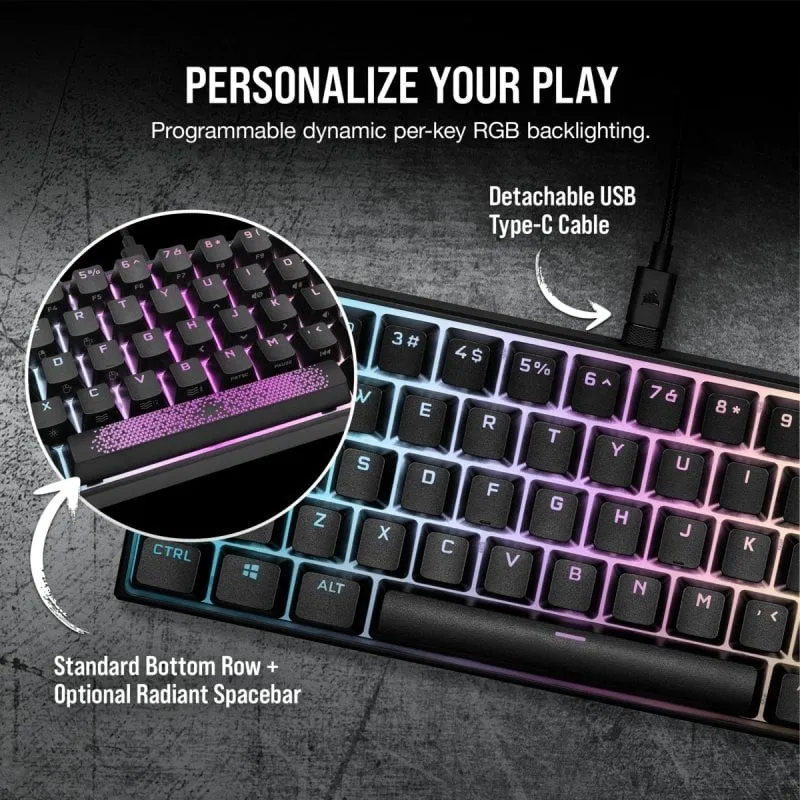 PERSONALIZA TU JUEGO: Demuestre su estilo con retroiluminación RGB dinámica por tecla y una barra espaciadora radiante incluida opcional, junto con un diseño de fila inferior estándar para que pueda intercambiar sus propios conjuntos de teclas personalizados.