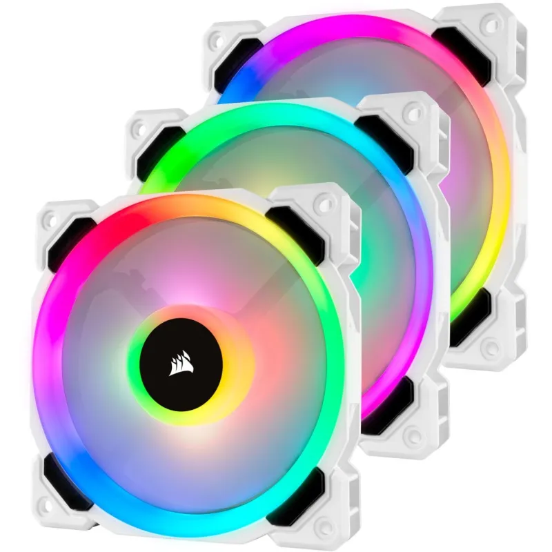 VENTILADOR RGB LED PWM BLANCO CON DOBLE BUCLE DE LUZ DE 120 MM LL120 RGB, PAQUETE DE TRES VENTILADORES CON LIGHTING NODE PRO: El ventilador CORSAIR LL120 RGB LED PWM 120 mm White Smart incluye 16 LED RGB direccionables individualmente repartidos en dos halos de luz en una sensacional carcasa blanca, que crean sorprendentes efectos visuales y de iluminación.