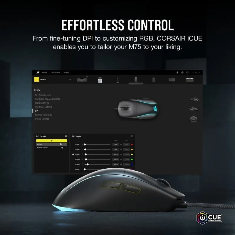 CONTROL SIN ESFUERZO: Despeje el camino hacia la victoria. El potente software CORSAIR iCUE le permite ajustar el ratón M75 a sus especificaciones exactas y poner a su disposición aún más opciones de control, como definir los preajustes de PPP y personalizar la iluminación.