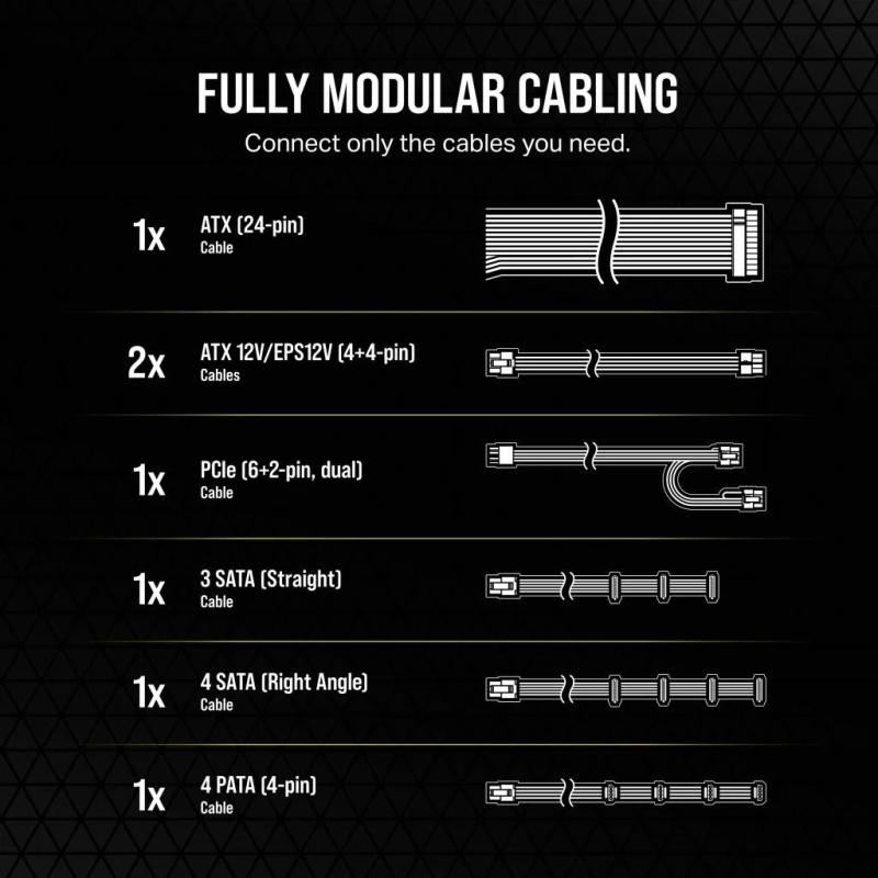 CABLEADO TOTALMENTE MODULAR: Mantén el desorden de cables al mínimo conectando solo los cables que tu sistema necesita y nada más. Cuatro conectores universales de 8 pines se pueden usar con cualquier cable de 8 pines, satisfaciendo todas las necesidades de energía de las placas base y GPUs modernas.