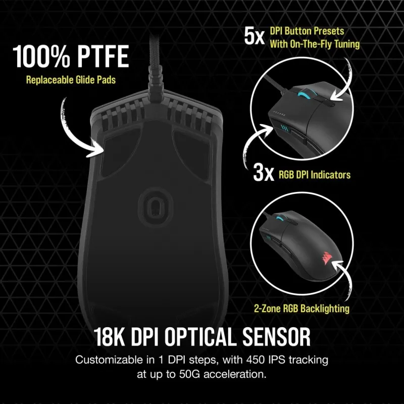 Equipado con tecnología de detección de movimientos óptico, este ratón proporciona una resolución de movimiento de 18000 DPI, totalmente personalizable con 5 modos de resolución para adaptarse a tu estilo de juego.