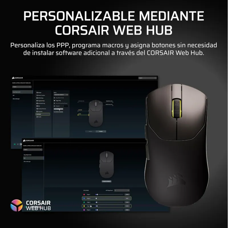 • ¿Puedo personalizar DPI y asignaciones sin instalar software? Sí, se gestiona desde Corsair Web Hub en el navegador.