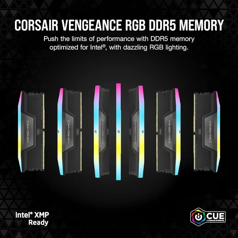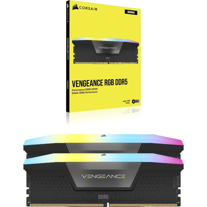KIT DE MEMORIA DDR5 DRAM VENGEANCE RGB DE 48 GB (2 X 24 GB) A 5200 MHZ C38 — NEGRO: La memoria CORSAIR VENGEANCE RGB DDR5 ofrece un rendimiento DDR5, mayores frecuencias y más capacidades optimizadas para placas base Intel, mientras que ilumina su PC con una iluminación RGB dinámica y direccionable individualmente en diez zonas.