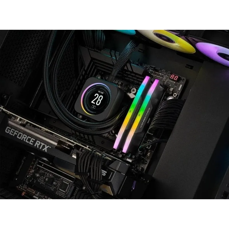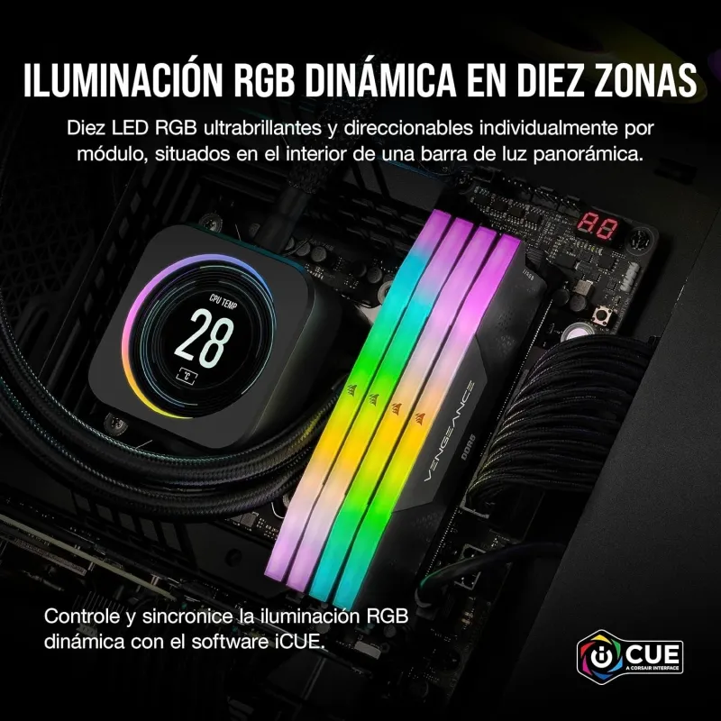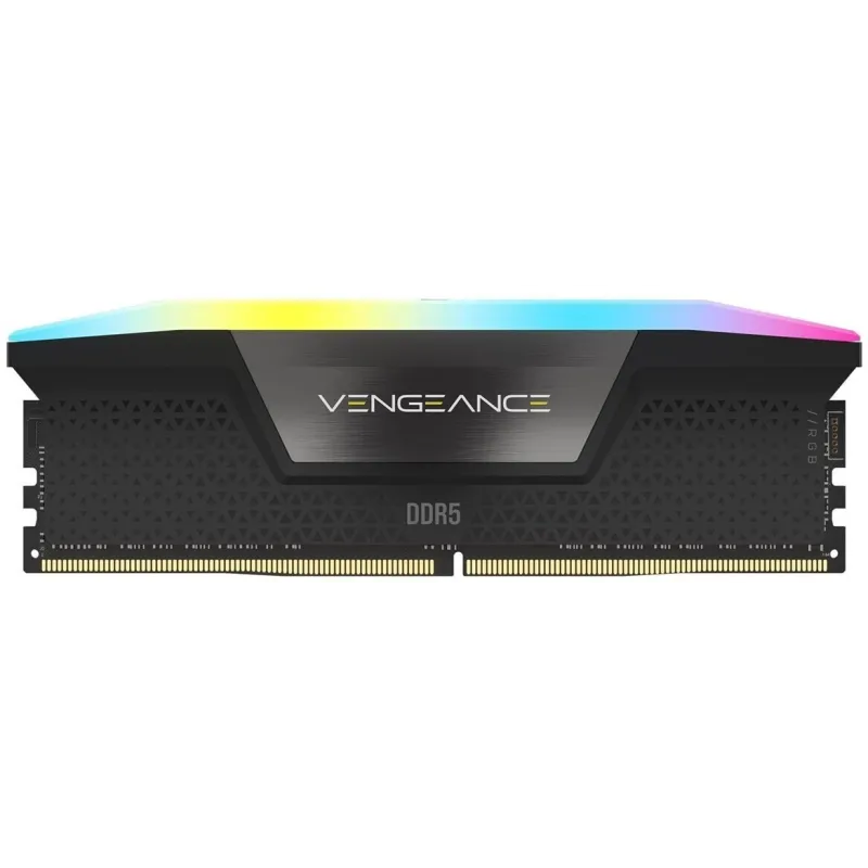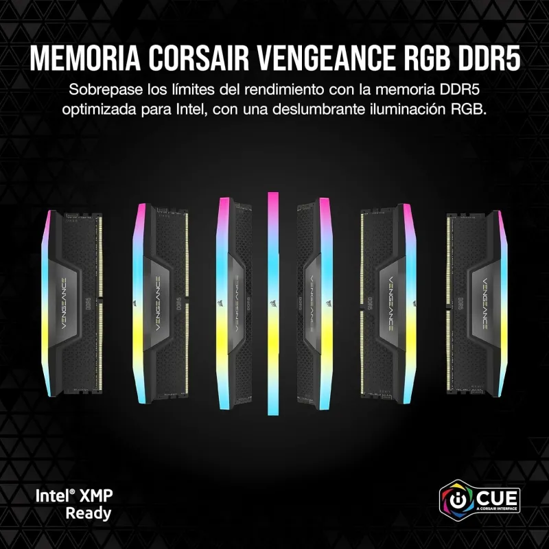 KIT DE MEMORIA CL30 VENGEANCE® RGB DE 32 GB (2 X 16 GB) DDR5 DRAM 6000 MT/S, NEGRO: La memoria CORSAIR VENGEANCE RGB DDR5 ofrece rendimiento DDR5, frecuencias más altas y mayores capacidades optimizadas para placas base Intel® mientras ilumina su PC con iluminación RGB dinámica de diez zonas direccionable individualmente.