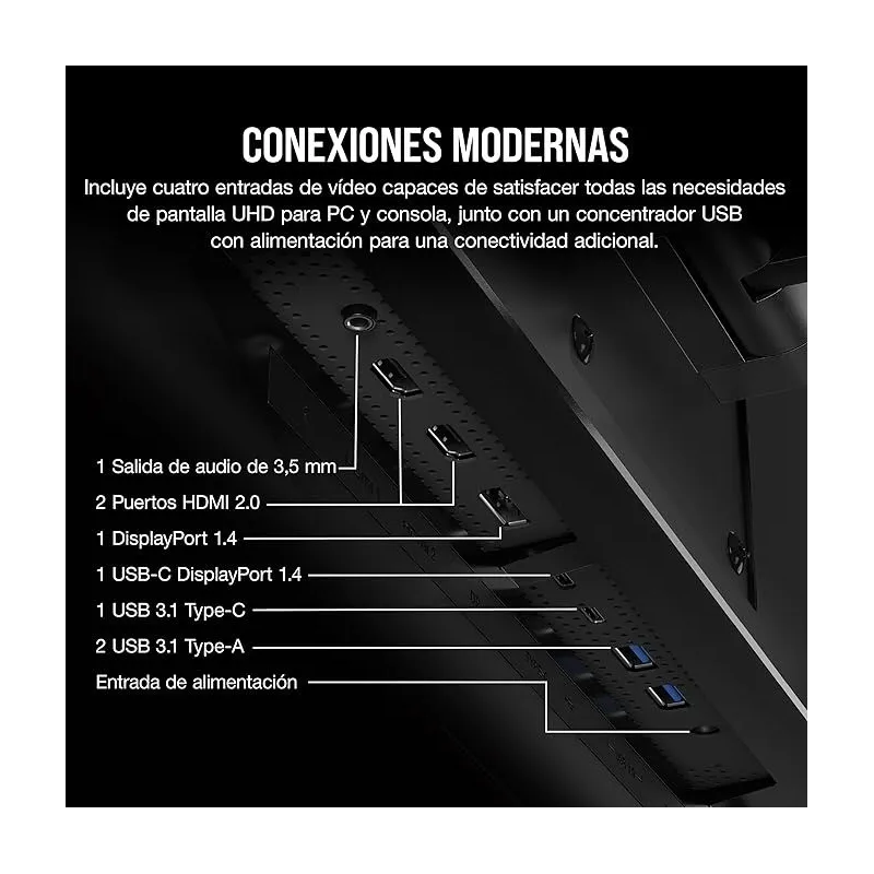 ¡CONEXIÓN VERSÁTIL Y SIN PROBLEMAS! Con puertos HDMI 2.1, DisplayPort 1.4 y USB Tipo C, así como salida de audio, este monitor ofrece una conectividad versátil para adaptarse a tus necesidades de juego y multimedia.