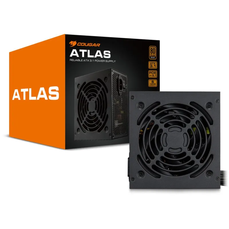 RENDIMIENTO FIABLE CON 650W DE POTENCIA ESTABLE La Fuente de Alimentación Cougar ATLAS 650W proporciona una potencia continua de 650 W, ideal para sistemas exigentes que requieren estabilidad y eficiencia energética. Gracias a su certificación 80 PLUS Bronze, optimiza el consumo eléctrico y reduce el calor generado, lo que mejora la vida útil de los componentes internos del PC. Esta fuente de alimentación garantiza un funcionamiento fluido incluso bajo cargas elevadas. Su diseño ATX 3.1 y el factor de forma estándar aseguran compatibilidad con la mayoría de las cajas del mercado. Además, la Fuente de Alimentación Cougar ATLAS 650W incorpora protecciones eléctricas esenciales que previenen daños por sobreintensidad, sobrecalentamiento o cortocircuitos, manteniendo la seguridad del sistema en todo momento.