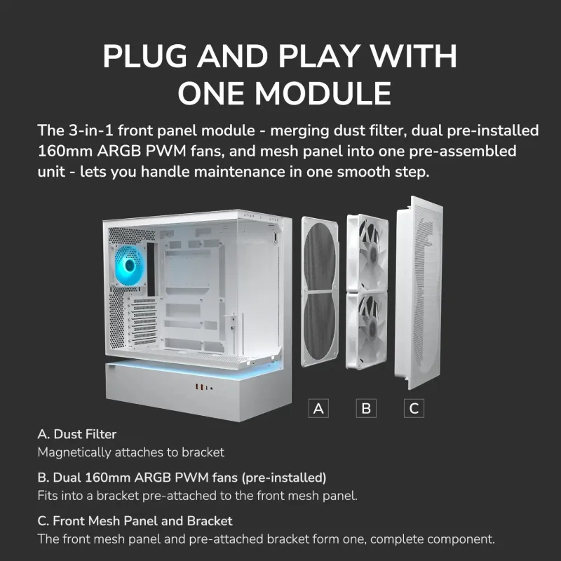 • Define prioridad de flujo de aire con ventiladores de entrada en el frontal mesh y salida trasera para un equilibrio silencioso.