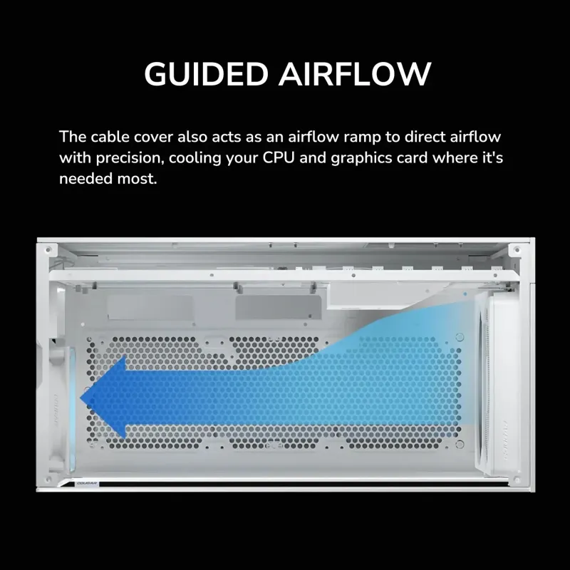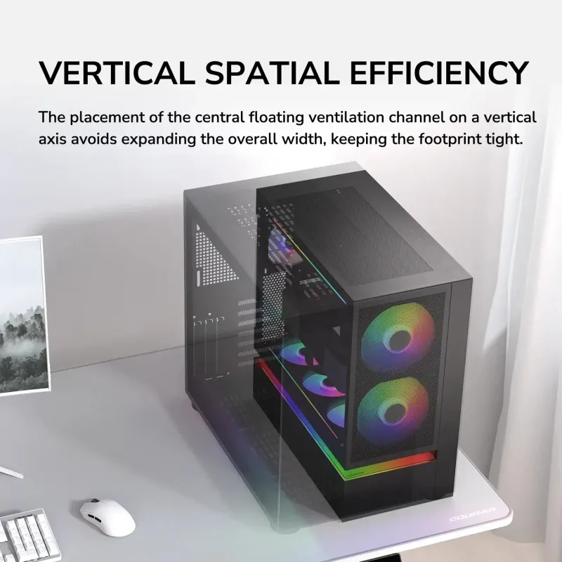 Beneficios clave: formato semitorre, frontal de malla (mesh), acabado negro, diseño de Cougar, enfoque en ventilación, estética sobria, estructura orientada a montaje ordenado, base versátil para distintos componentes
