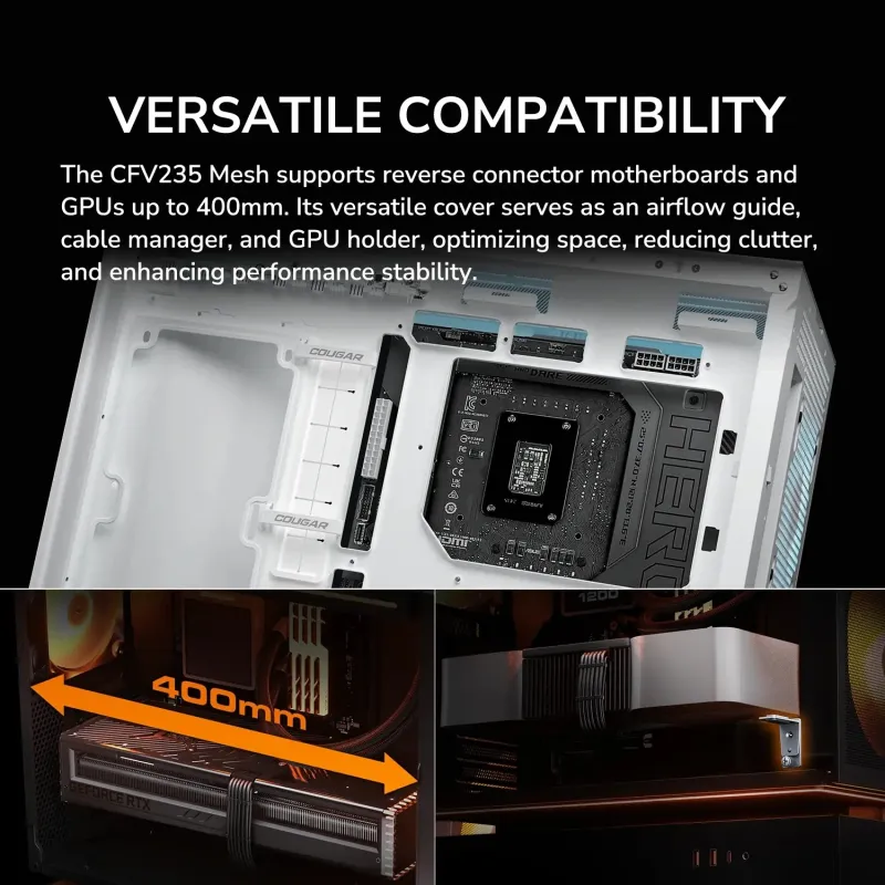 Cougar CFV235 Mesh Negro con frontal mesh y acabado negro que prioriza la entrada de aire para un montaje ordenado y versátil.