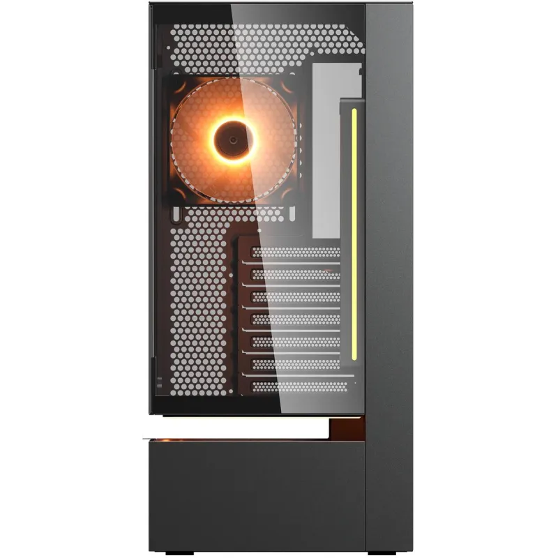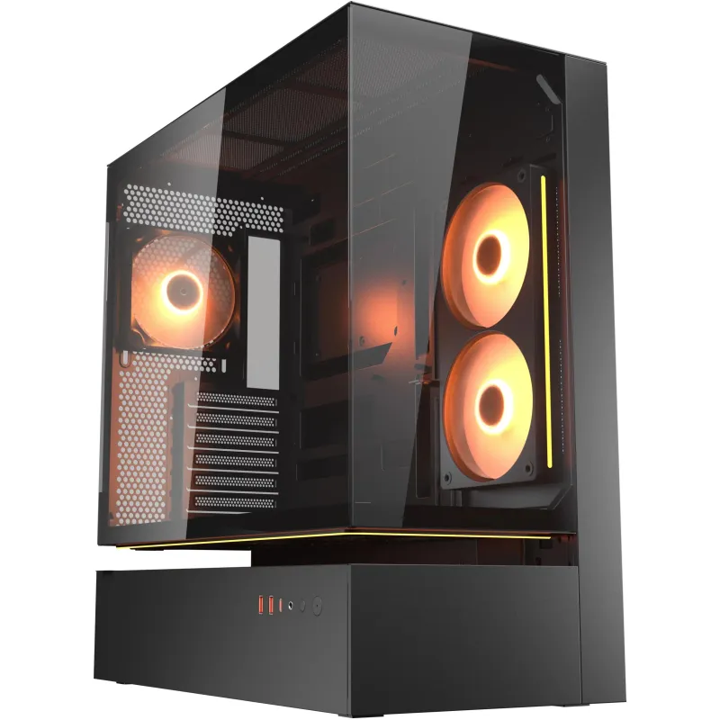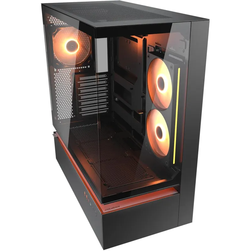 La Torre Cougar CFV235 Negro está equipada con un sistema de iluminación RGB multicolor que transforma cualquier configuración en una experiencia visual envolvente. Esta iluminación está integrada en los ventiladores de 120 mm preinstalados, lo que no solo mejora el aspecto estético, sino que también mantiene una refrigeración eficiente. Gracias al botón de control de iluminación RGB, puedes personalizar fácilmente los efectos de luz según tu estilo. Esta funcionalidad convierte a la Torre Cougar CFV235 Negro en una opción ideal para jugadores que buscan destacar su equipo sin sacrificar el rendimiento térmico. Además, su ventana lateral de vidrio templado permite apreciar cada detalle del interior, resaltando la calidad de los componentes y la organización del cableado.