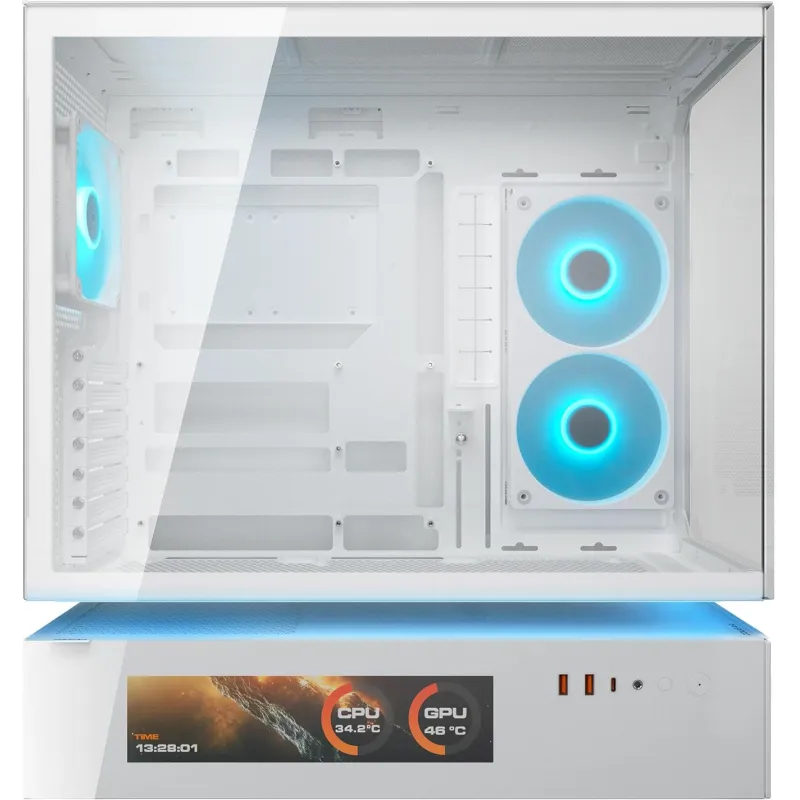 Una de las características más innovadoras de la Torre Cougar CFV235 Vision Blanco es su pantalla LCD 9.16 pulgadas incorporada. Con una resolución de 1920 x 462 píxeles, esta pantalla permite monitorizar datos del sistema en tiempo real de forma clara y precisa. Esta funcionalidad resulta especialmente útil para usuarios avanzados que desean tener control total sobre el rendimiento de su equipo. La integración de esta pantalla dentro del chasis le da un valor añadido, transformando la torre en una herramienta de gestión visual que combina tecnología y diseño de forma eficaz.