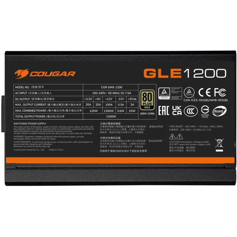 Fuente de Alimentación Cougar GLE-1200 con 1200W eficiencia 80 PLUS Gold diseño modular y 6 conectores PCIe para alto rendimiento.