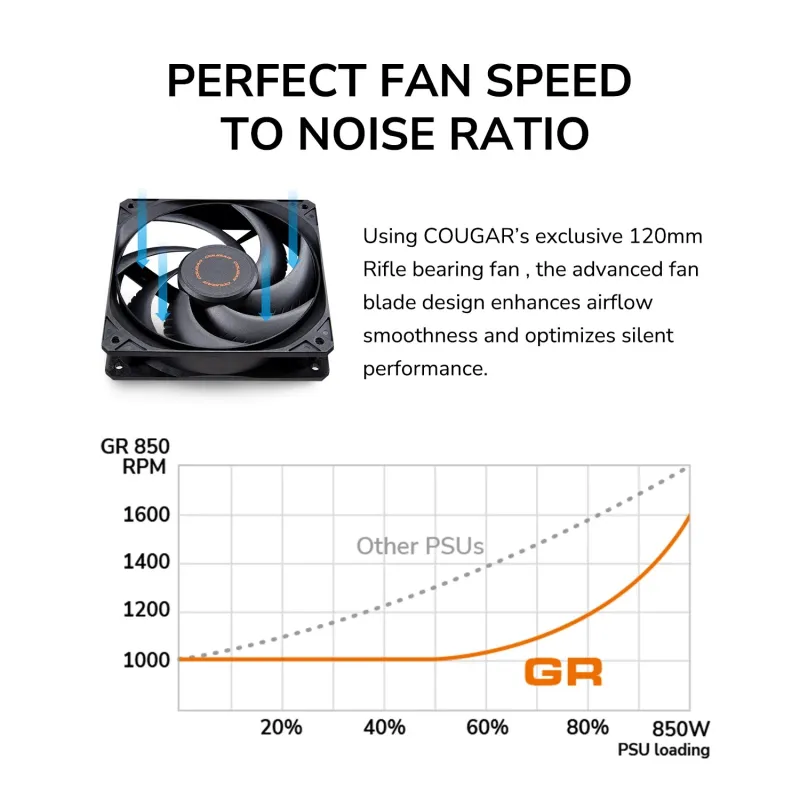 DISEÑO COMPACTO Y EFICIENTE PARA MONTAJES MODERNOS: Con unas dimensiones de 140 x 150 x 56 mm y un peso de tan solo 1,85 kg, la Fuente de Alimentación Cougar GR750 es perfecta para cajas de tamaño estándar o reducido. Su tamaño compacto facilita el montaje y mejora la circulación del aire en el interior del equipo, contribuyendo a una mejor refrigeración general. A pesar de su tamaño, esta fuente ofrece una potencia total 750 W con una entrega sólida y constante de energía. Los conectores PCI-E 8 pines permiten alimentar tarjetas gráficas exigentes sin problemas de compatibilidad. Además, sus múltiples salidas de corriente continua permiten una distribución equilibrada de la carga, asegurando el funcionamiento óptimo de todos los componentes conectados. Ideal para usuarios que buscan una fuente potente y bien diseñada.