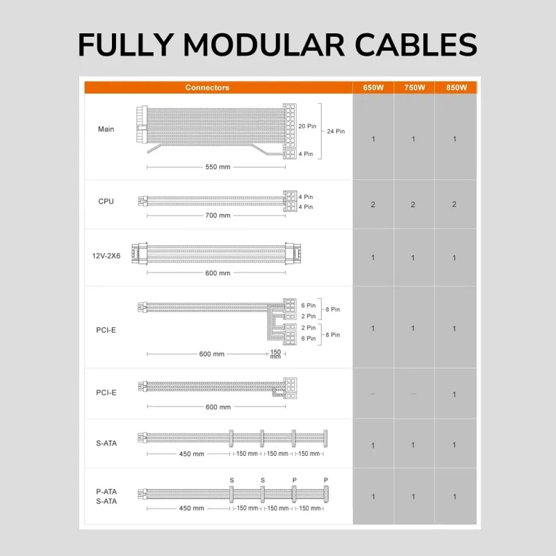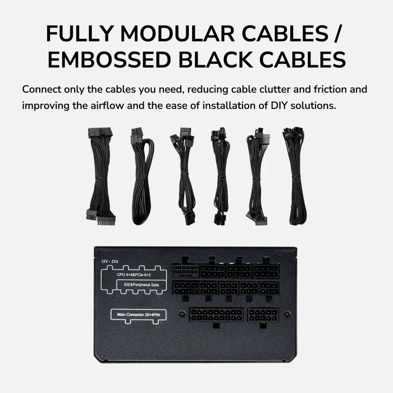 VERSATILIDAD PARA TODO TIPO DE CONFIGURACIONES: Con una amplia gama de conectores, la Fuente de Alimentación Cougar GR750 se adapta fácilmente a diferentes configuraciones de hardware. Incluye dos conectores CPU 8 pines (4+4), seis conectores S-ATA, dos Molex y un conector ATX de 24 pines, además de los imprescindibles conectores PCI-E 8 pines. Esto permite alimentar desde placas base estándar hasta sistemas avanzados con múltiples discos duros y tarjetas gráficas. Su potencia total 750 W asegura una entrega estable de energía, incluso en equipos con altas demandas. Esta versatilidad la convierte en una opción excelente tanto para usuarios domésticos como profesionales que buscan fiabilidad y compatibilidad sin complicaciones.