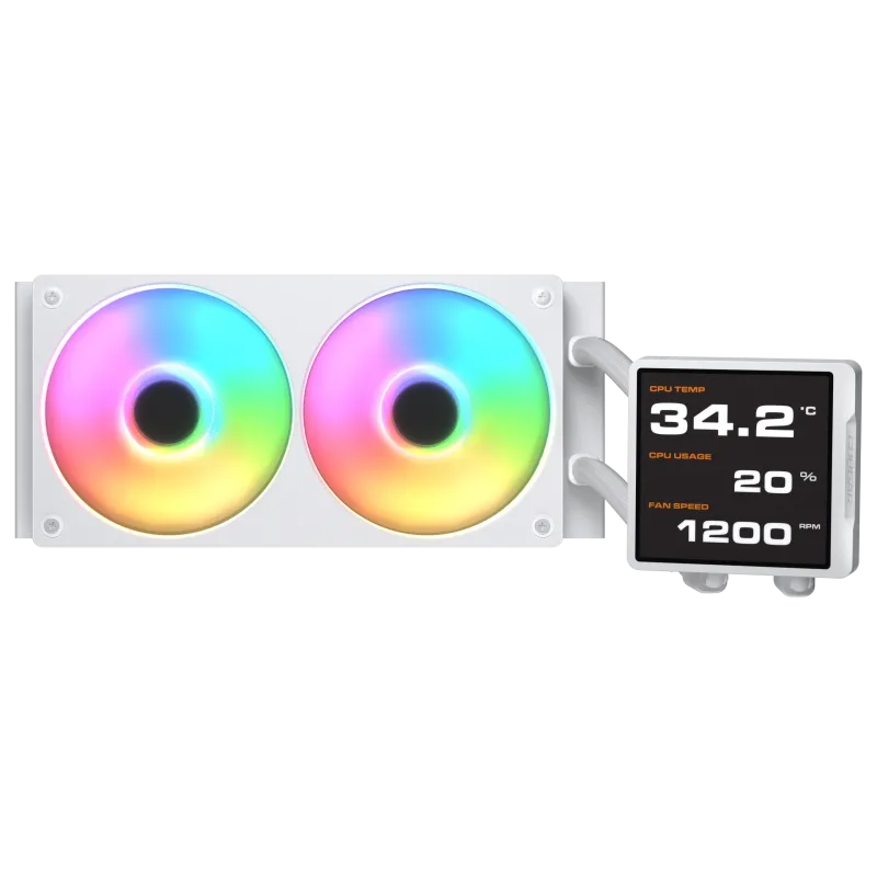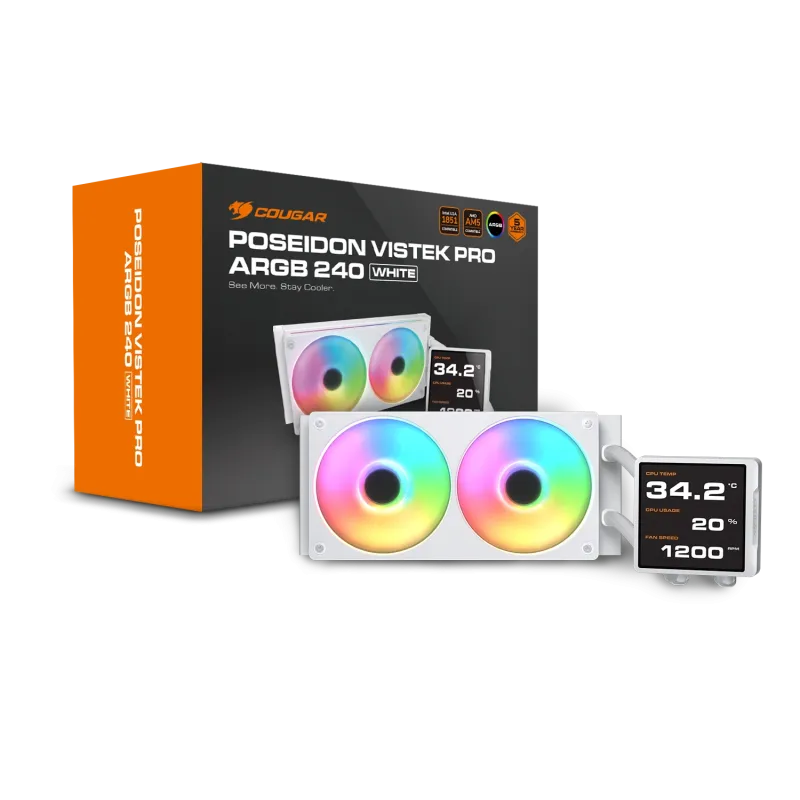 El Cougar Poseidon Vistek PRO aRGB 240 Blanco incorpora una pantalla IPS que muestra datos en tiempo real sobre el estado de la refrigeración. Esta funcionalidad permite al usuario monitorizar fácilmente la temperatura, velocidad de la bomba y rendimiento general del sistema. Combinado con el radiador de aluminio y los tres ventiladores de 12 cm, ofrece una solución completa que aúna tecnología avanzada y control visual. La pantalla no solo mejora la funcionalidad, sino que también aporta un toque innovador y profesional al equipo, ideal para entusiastas y profesionales del hardware.